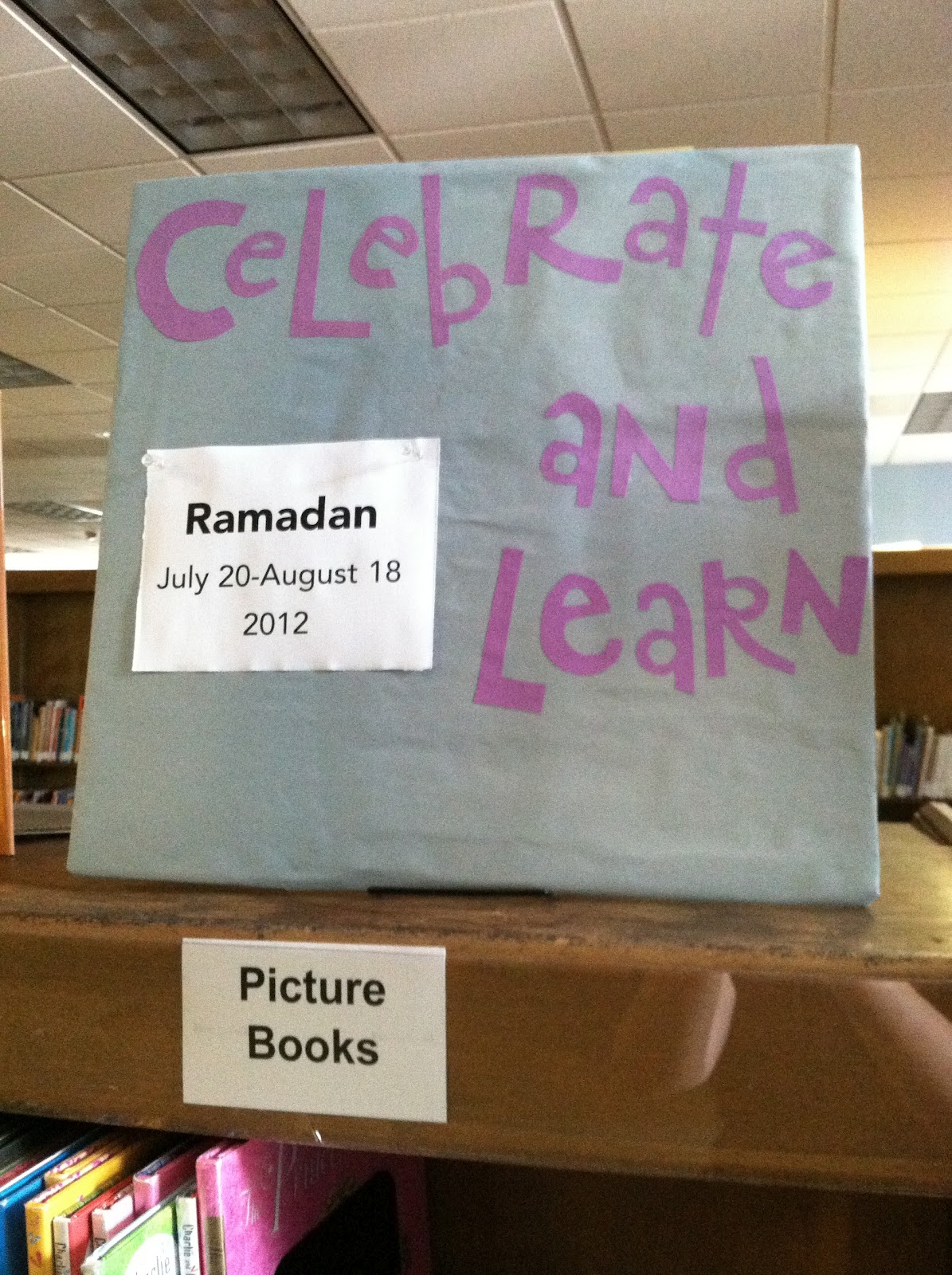 Ramadan snuck up on me y'all! It starts tomorrow and if I hadn't been in a training on Monday where someone mentioned it, it would have passed me by. We don't have a whole lot of books on Ramadan so I supplemented with books on Islam and this giant green crescent and star. And yes, I know that the crescent and star aren't actually symbols of Islam, but it's really hard to find visual representations for a religion that eschew symbols.